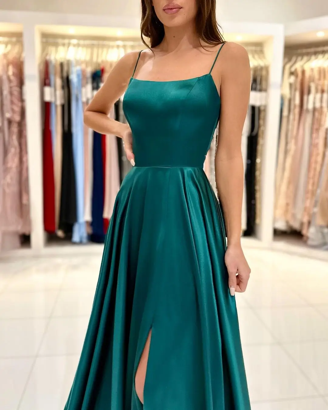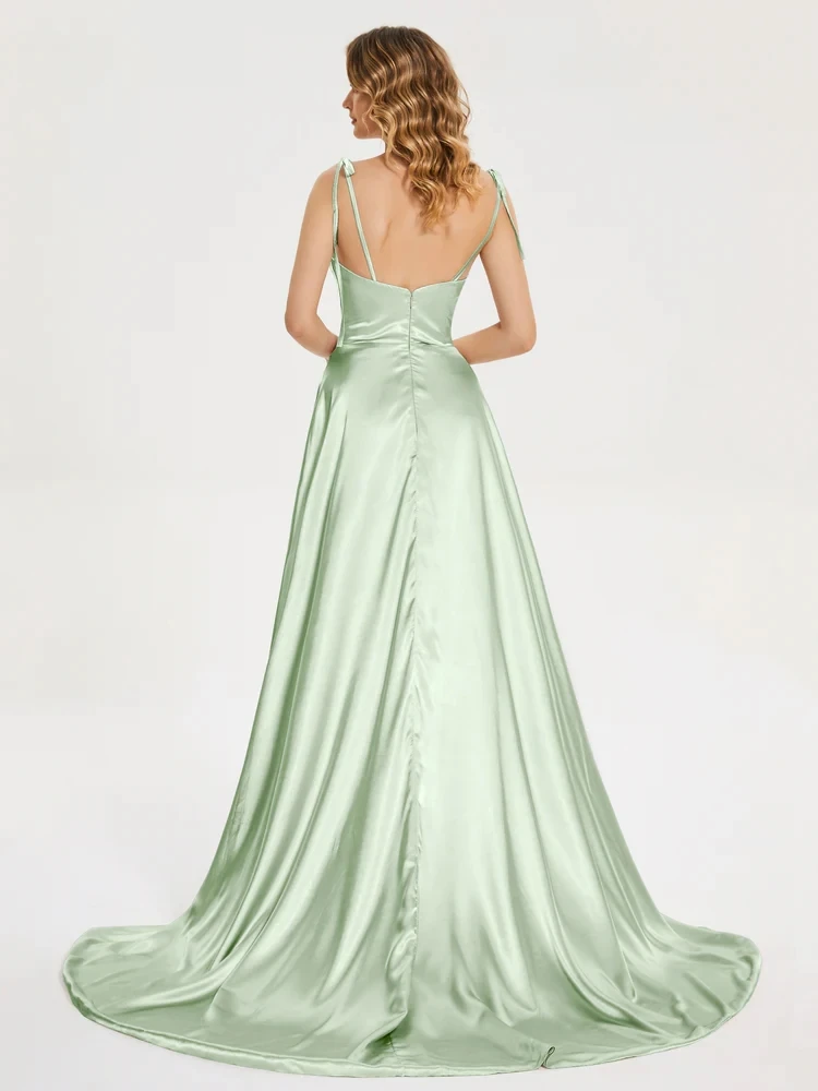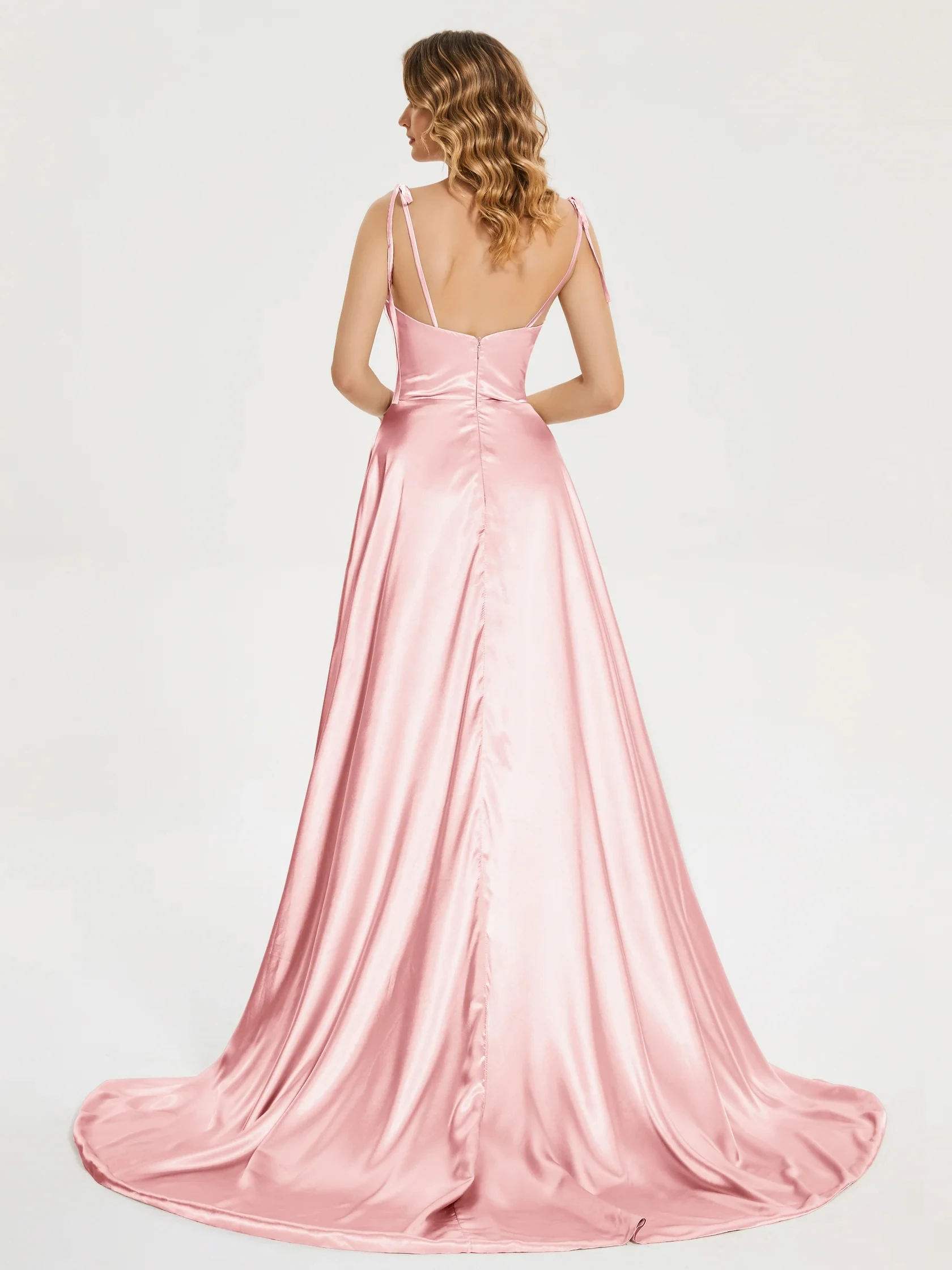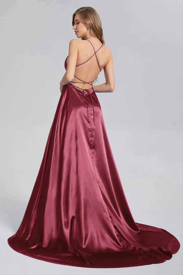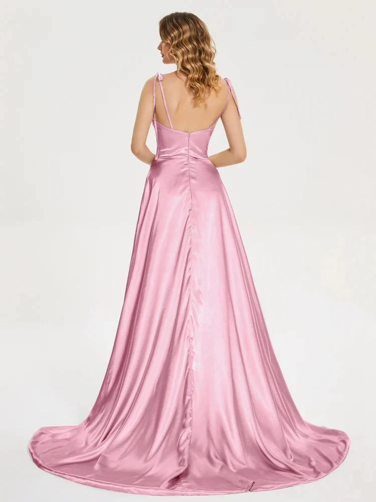 BABYONLINE Prom Dress Satin A-line Gown with Strappy Lace Up Back and High Skirt Slit Floor Length Wedding Bridesmaid Dresses
