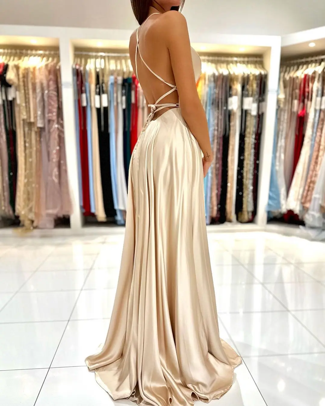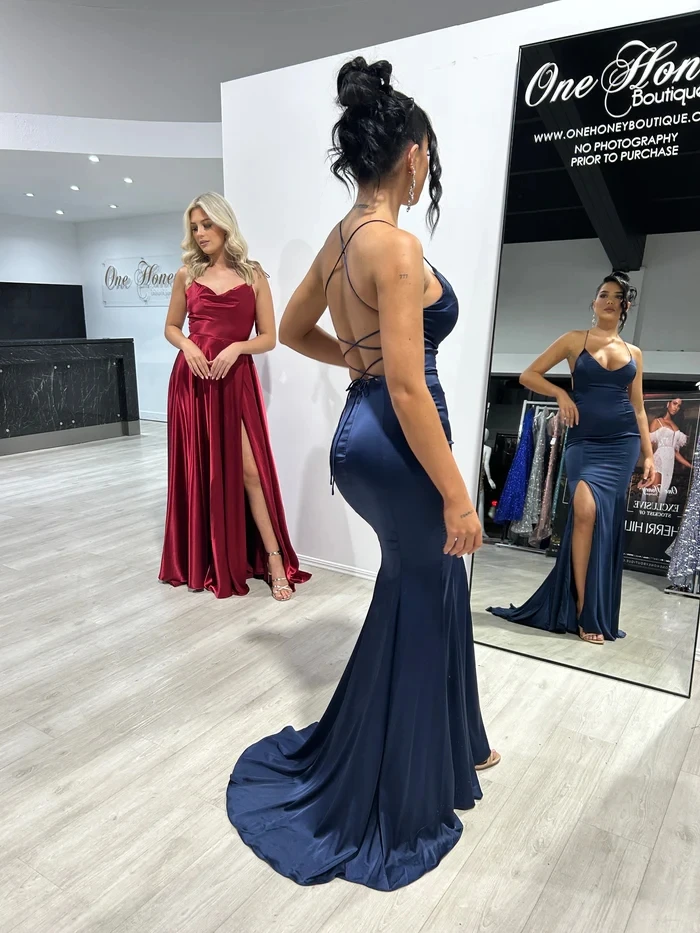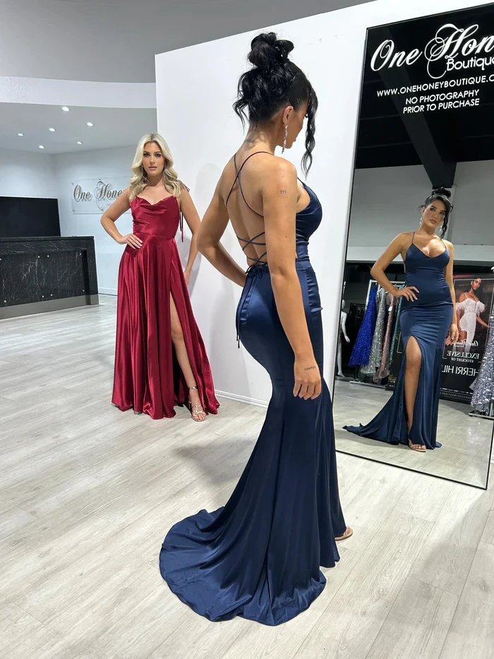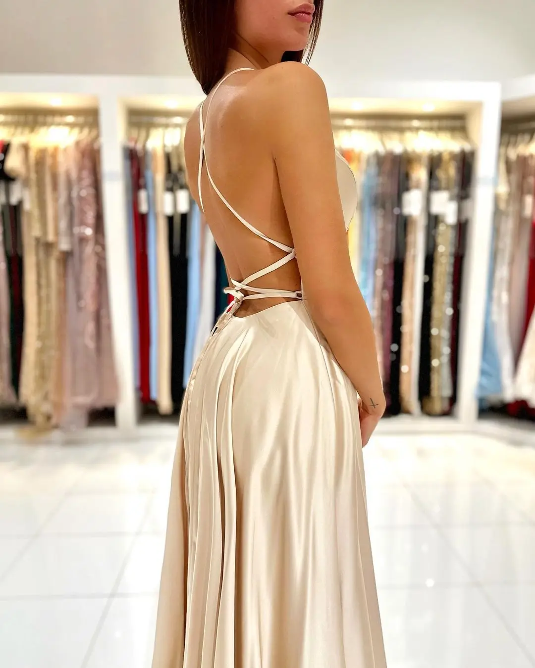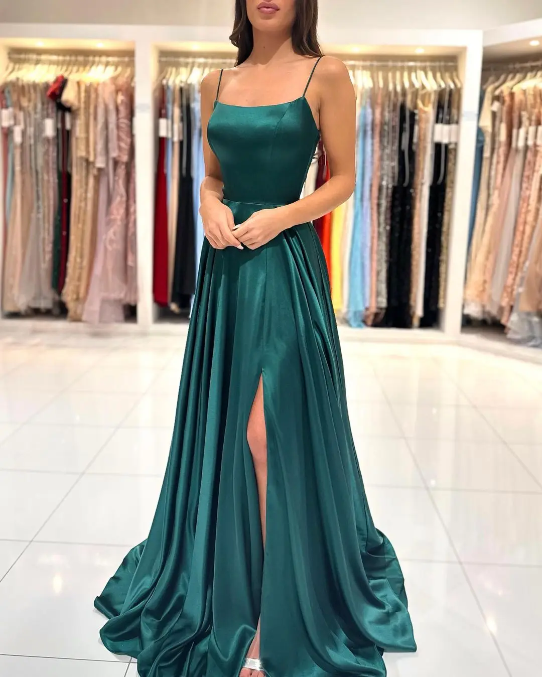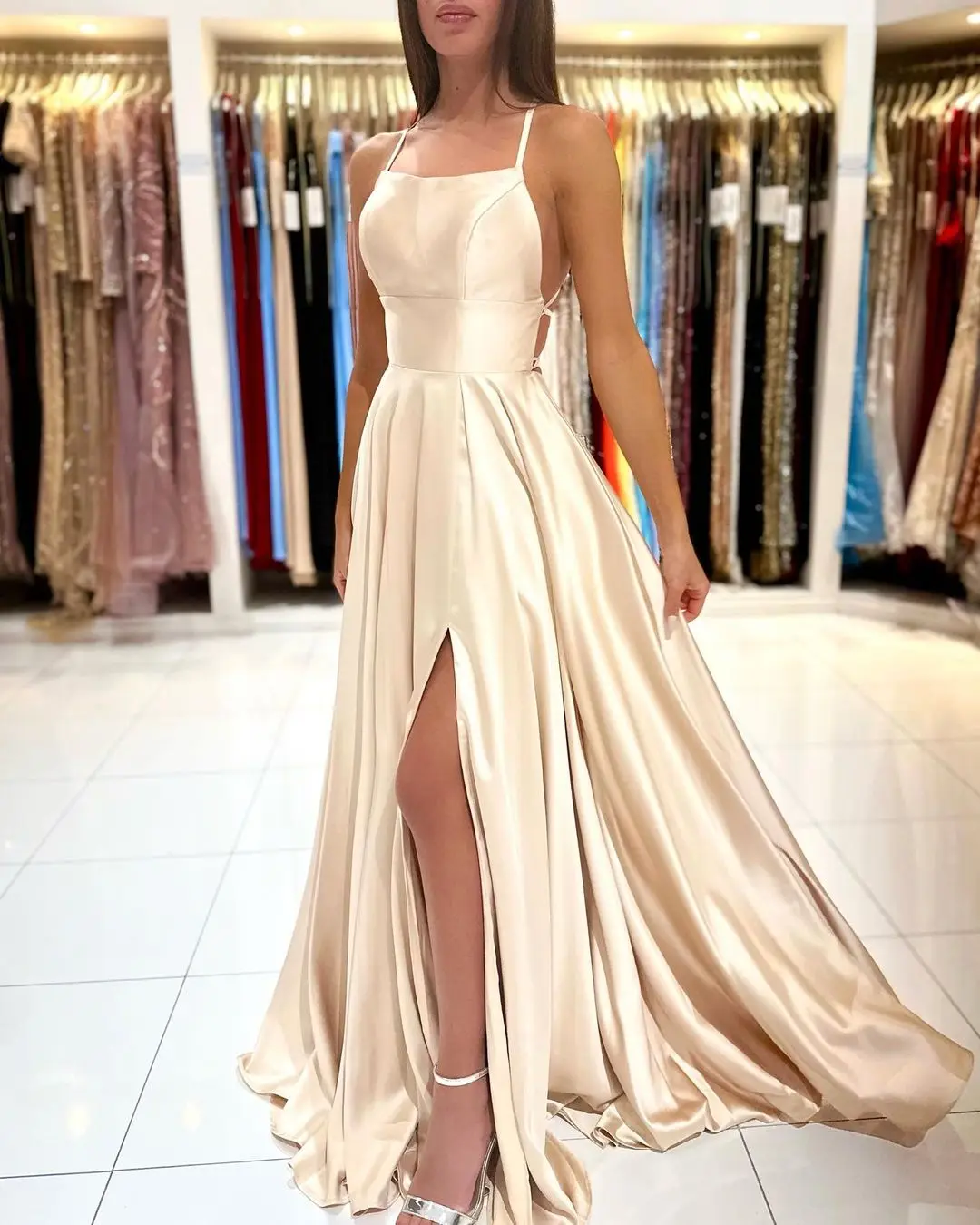 BABYONLINE Prom Dress Satin A-line Gown with Strappy Lace Up Back and High Skirt Slit Floor Length Wedding Bridesmaid Dresses