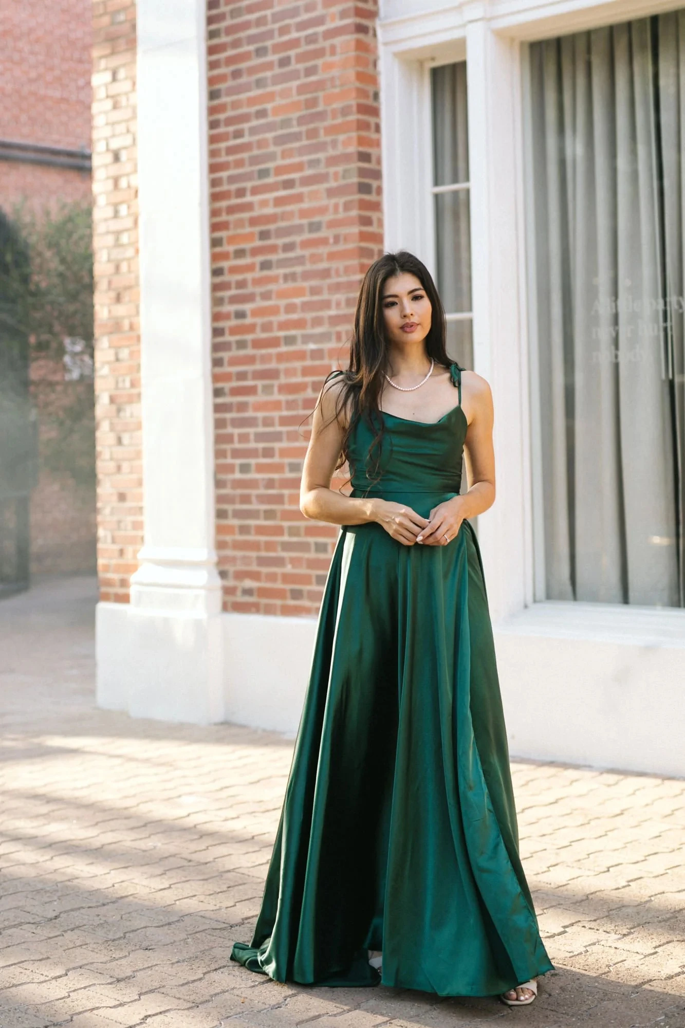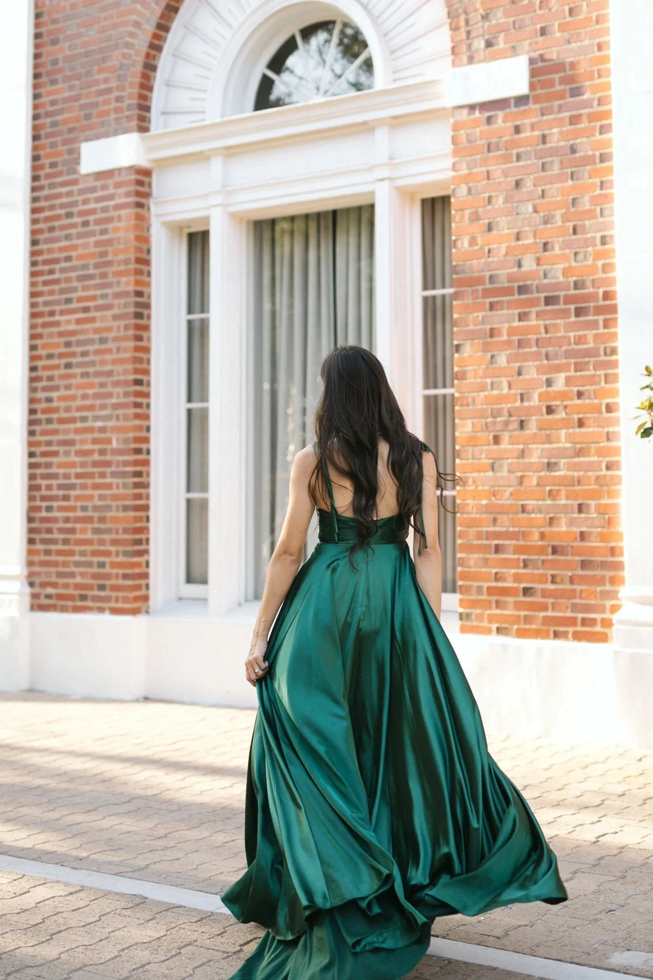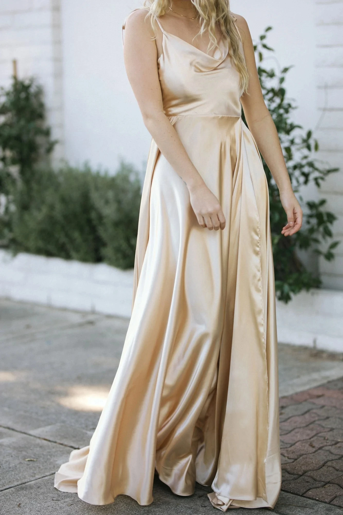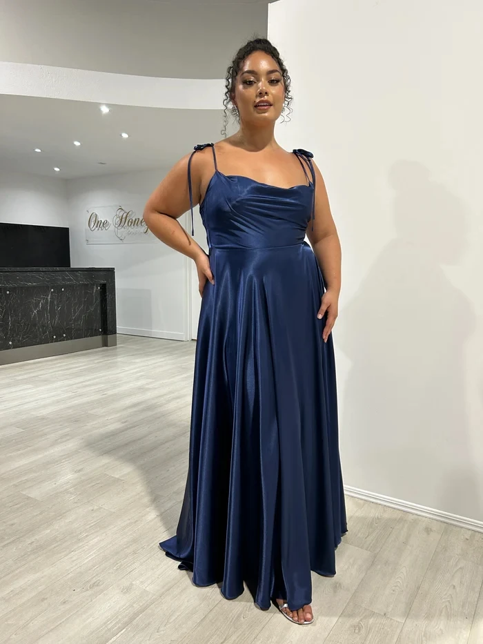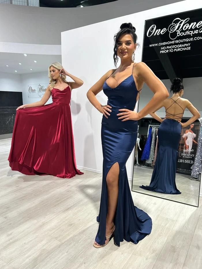 BABYONLINE Prom Dress Satin A-line Gown with Strappy Lace Up Back and High Skirt Slit Floor Length Wedding Bridesmaid Dresses