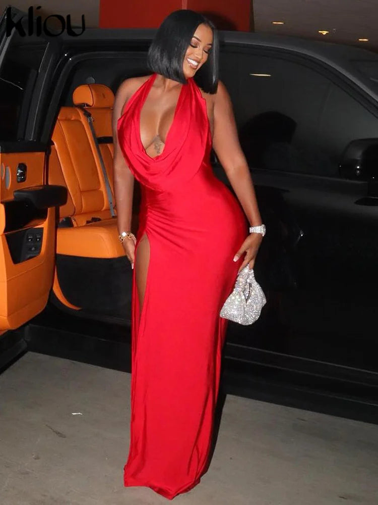 kliou Summer Women Shiny Attractive Maxi Dress Halter Backless Side Split Swing Neck Slim Robe Female High Street Party Vestidos