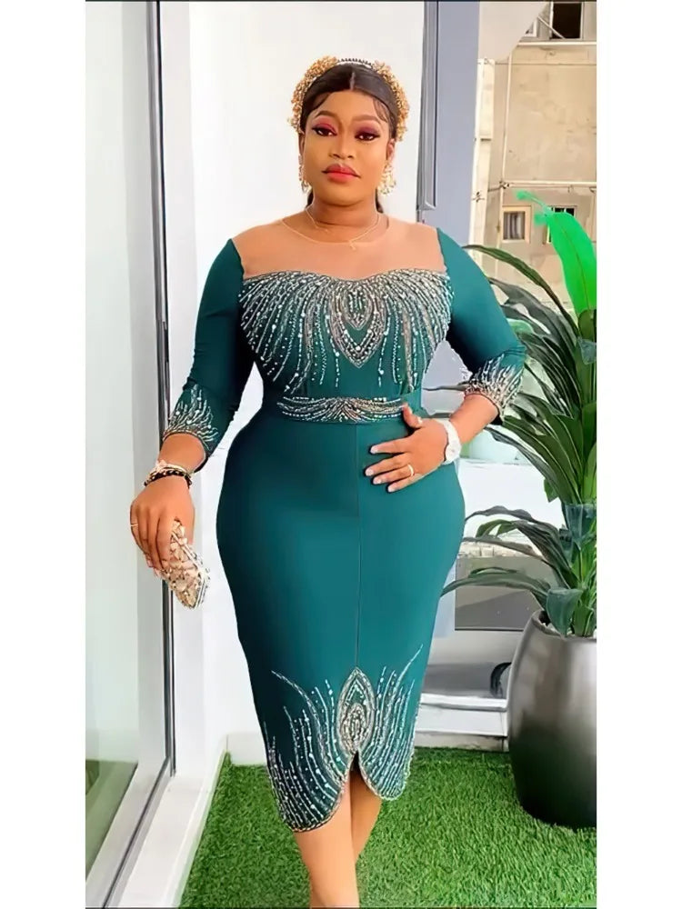 Luxury Hot Drills Evening Party Dress O Neck Mesh Patchwork Slim Fit Knee Length Formal Occasion Event Church Gowns 2024 New In