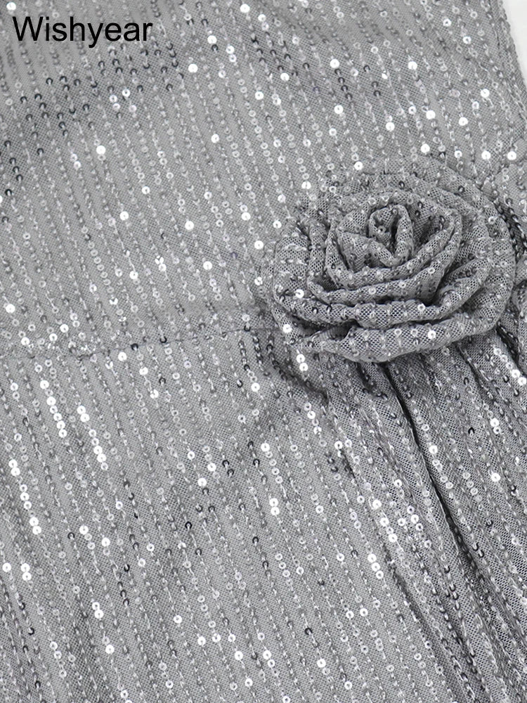 New Silvery 3D Flower Sequin Bodycon Birthday Party Mini Dress Woman Sexy Off Shoulder Sleeveless Backless Slim Evening Gowns