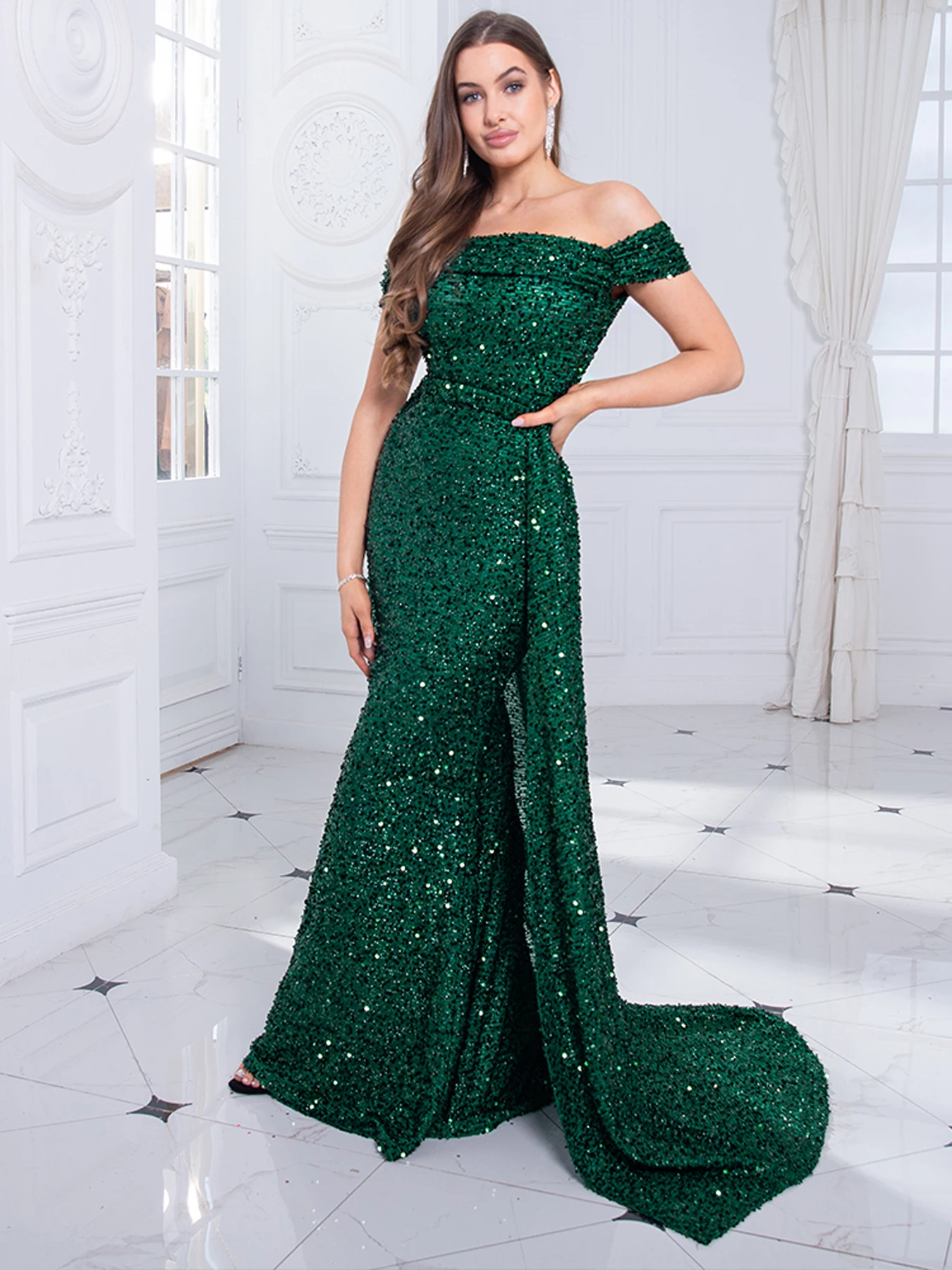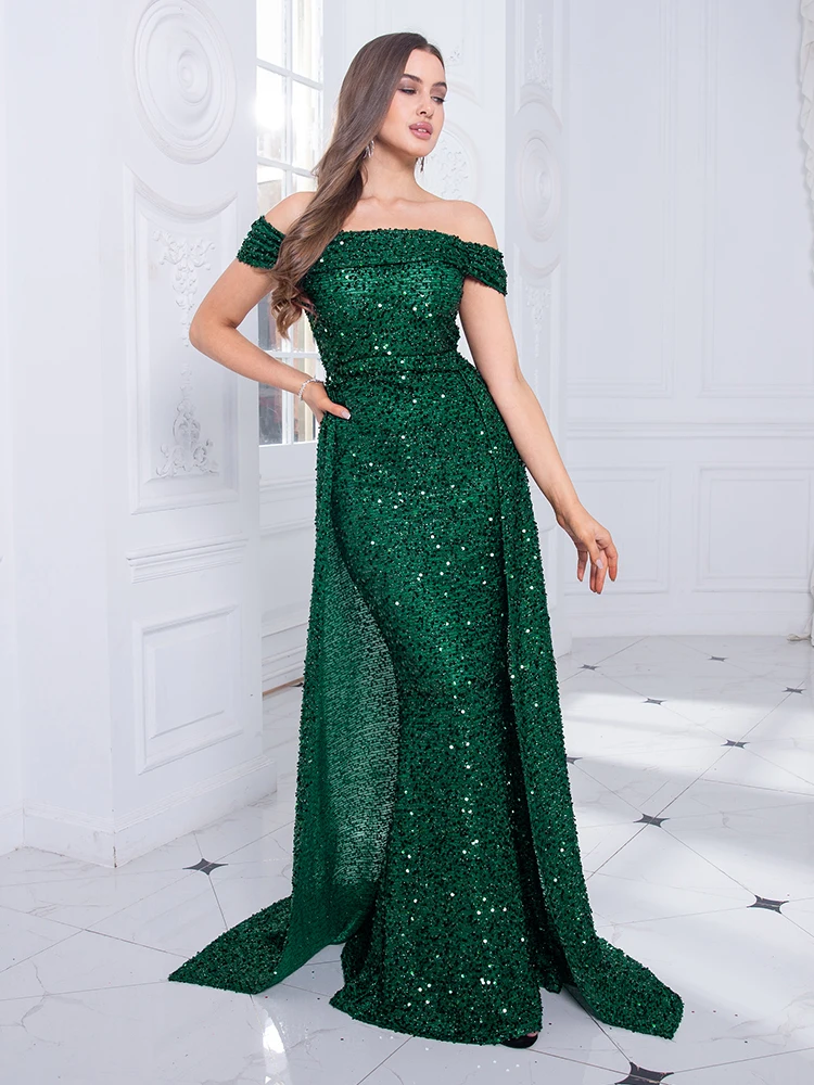 Off Shoulder Ruched Sequined Elegant Prom Gown Sleeveless Navy Green Evening Dress Floor Length
