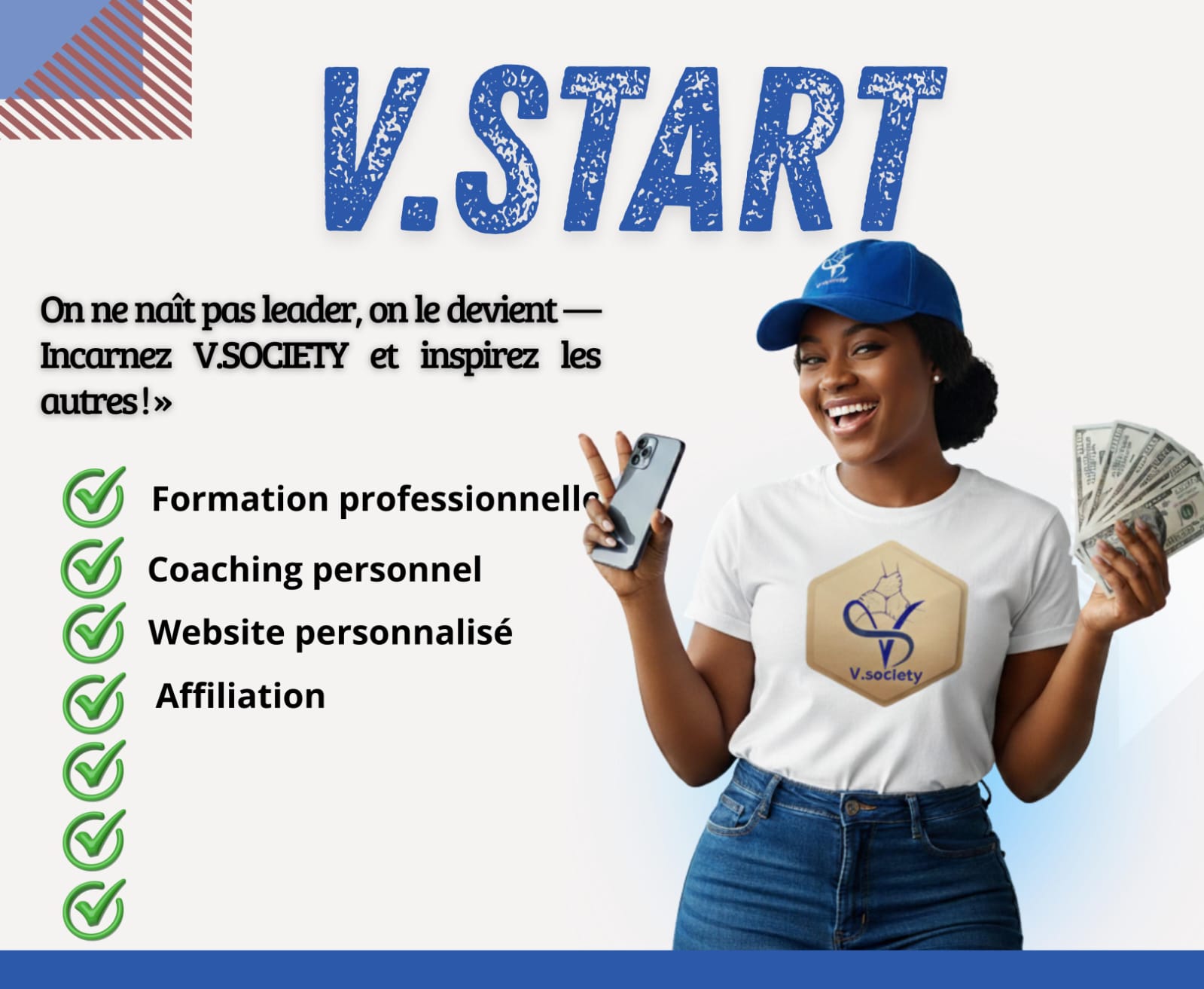 V.START est la porte d’entrée parfaite pour toute personne souhaitant débuter une activité en ligne de manière simple, professionnelle et efficace. Aucun diplôme, aucune expérience requise — juste la volonté d’apprendre et de réussir.