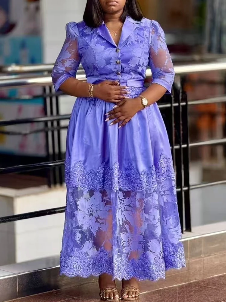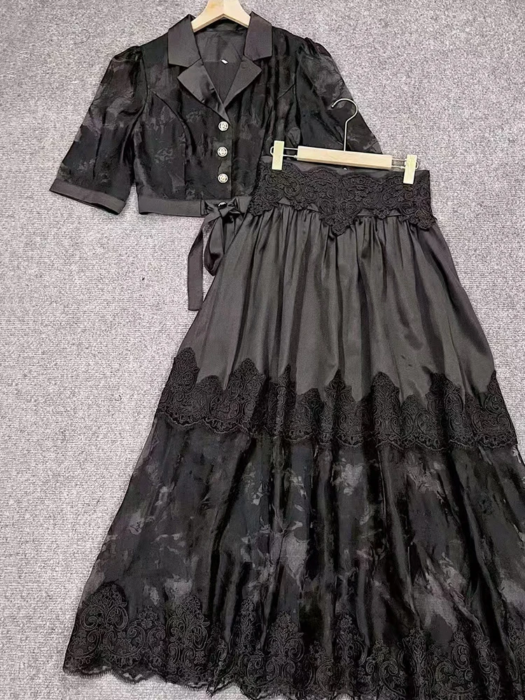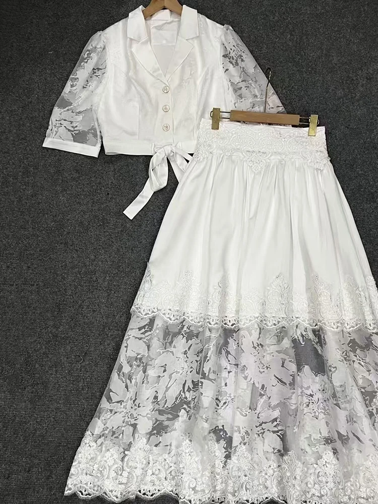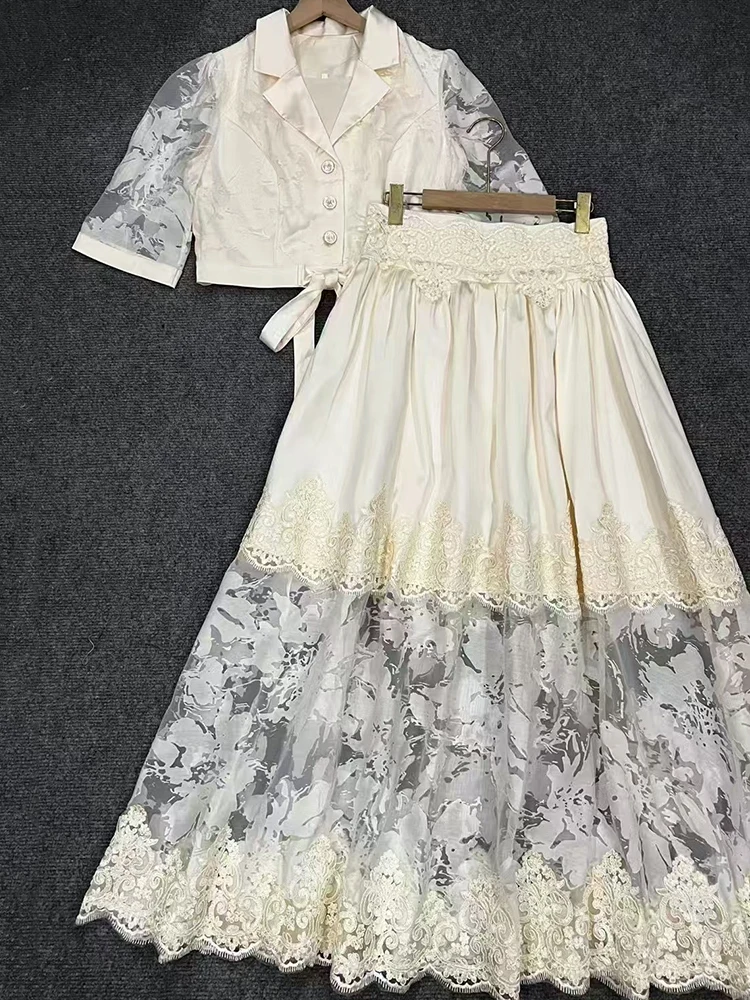 Retro embroidered lace lapel short shirt two-piece set for 2025 summer women's wear + applioned high-waisted loose skirt set