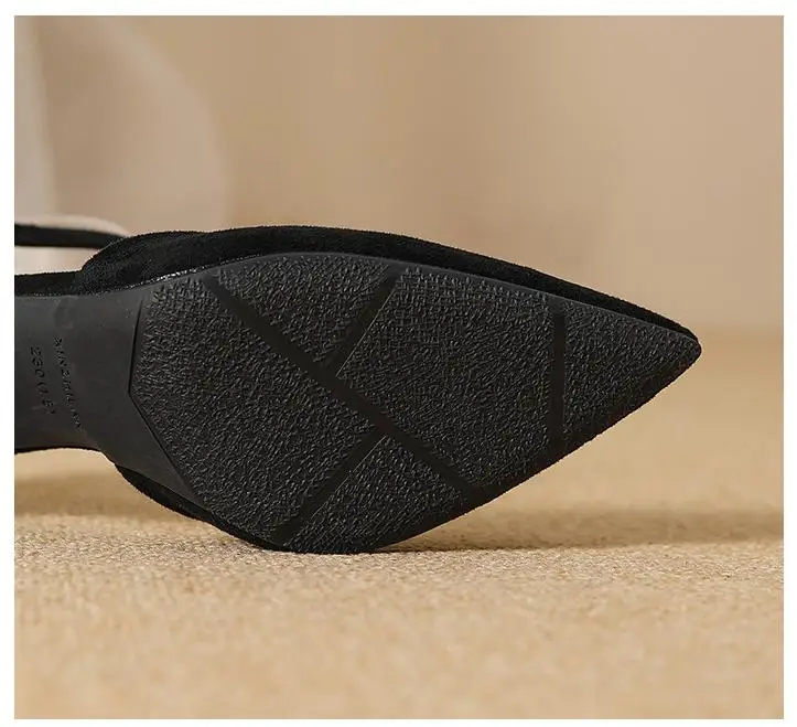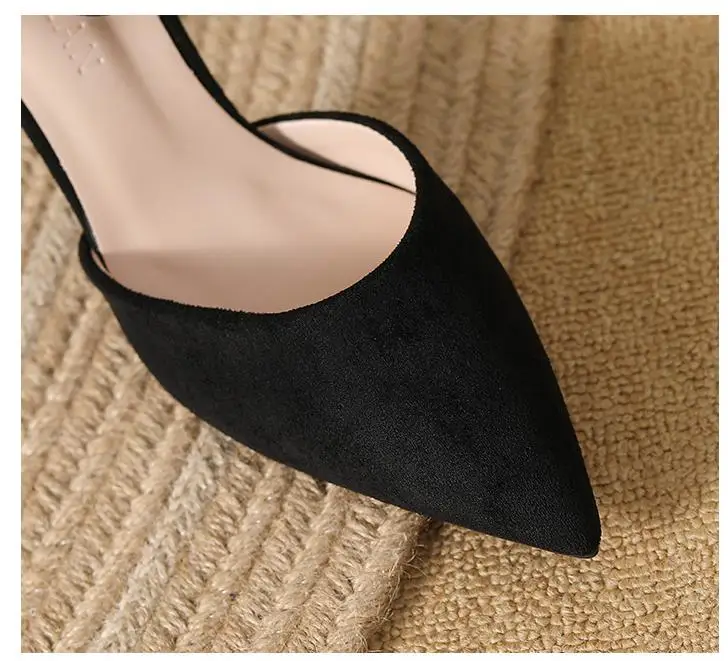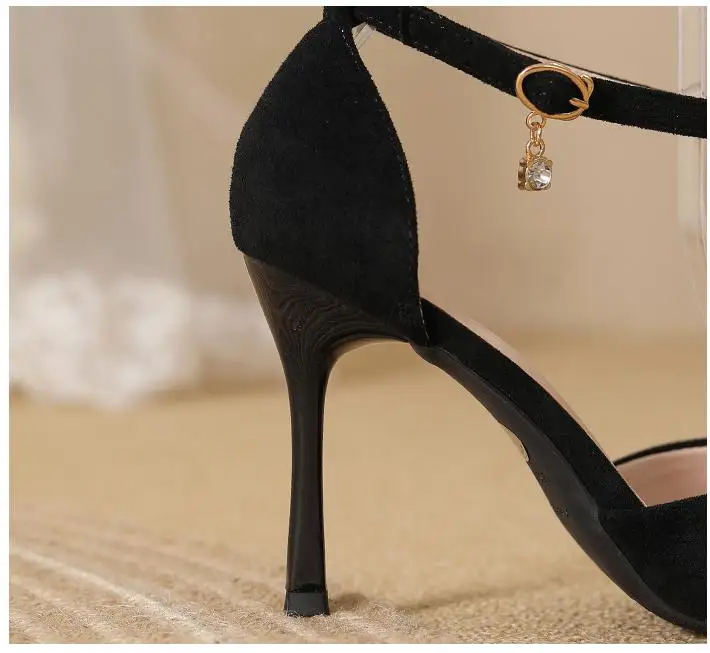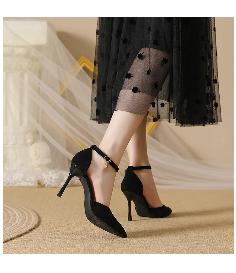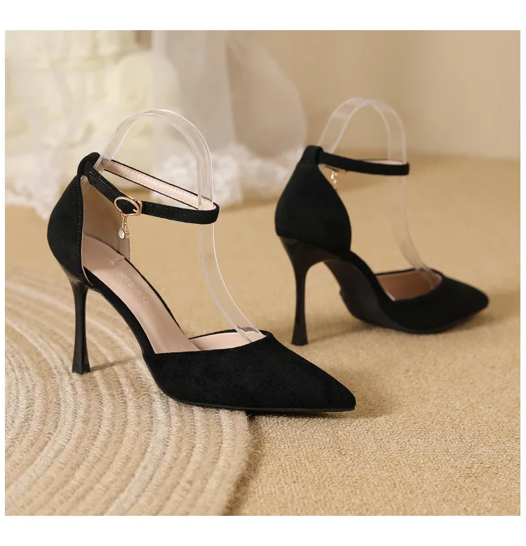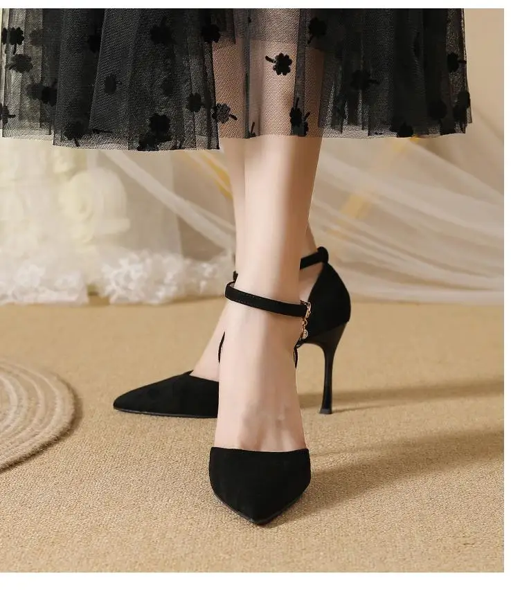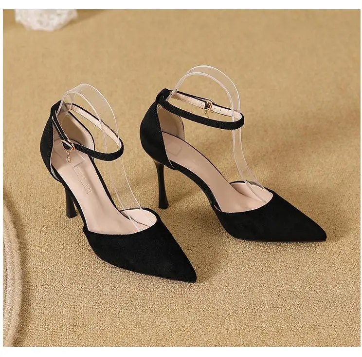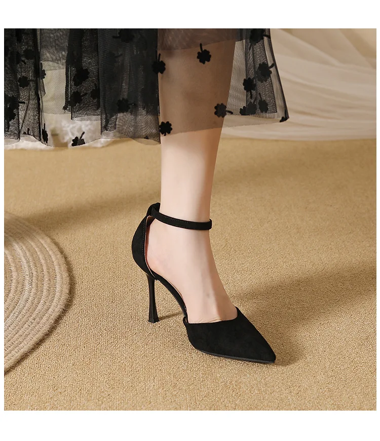 Small Size 30-44 Women High Heel Shoes Suede Thin Heels Ankle Strap Solid Color Point Toe Black Shoes