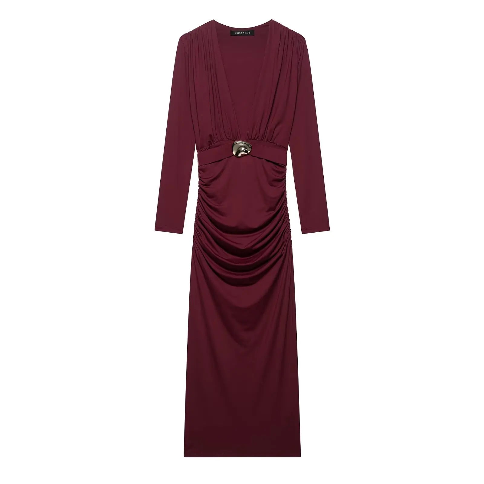 TRAFZA Women Spring New Sexy Deep V-neck Inlaid Belt Long Sleeve Slim Dress Female Temperature Evening Dress Pleated Long Dress